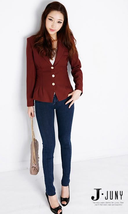 Mẫu 7 : Quần jeans dài ôm, có túi, đính nút trang trí màu nổi bật, nền vải loan nhẹ, kiểu dáng trẻ trung