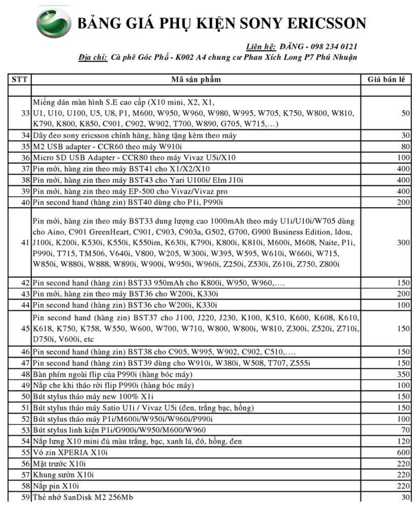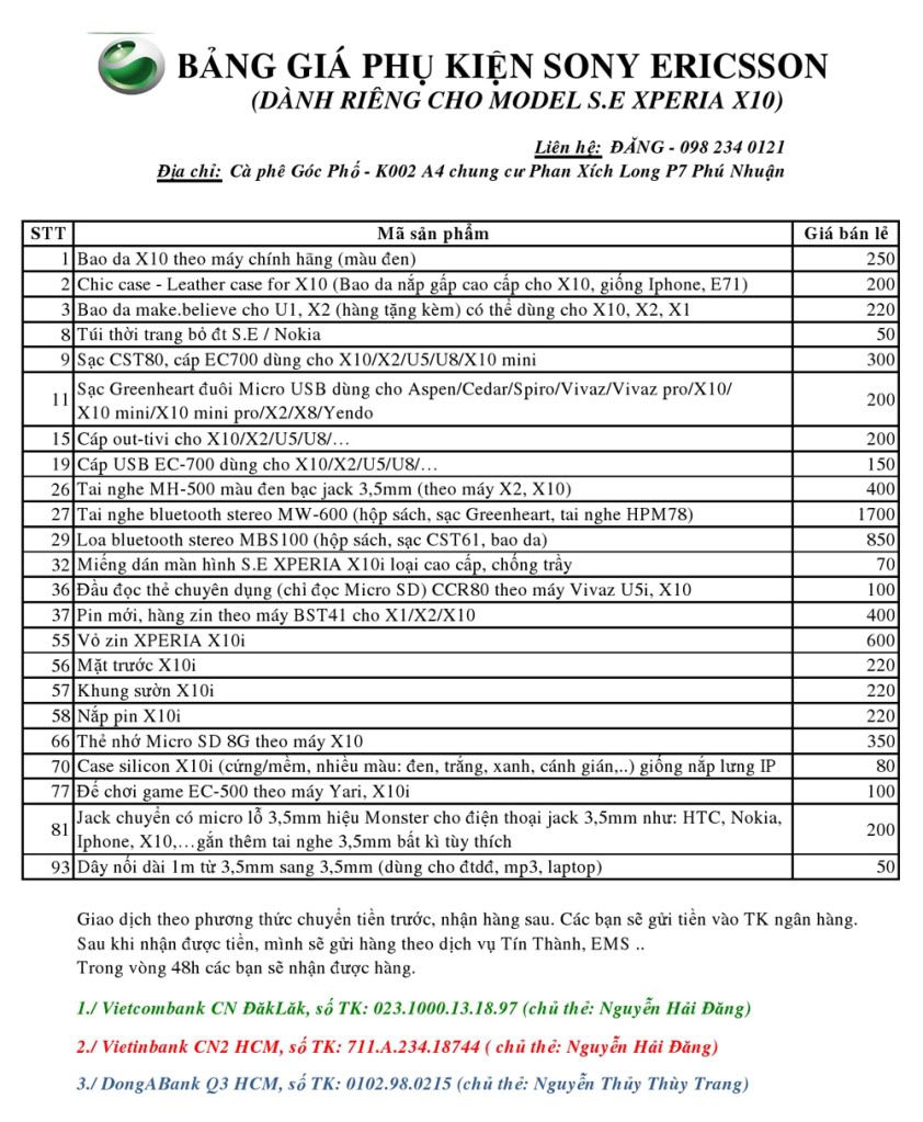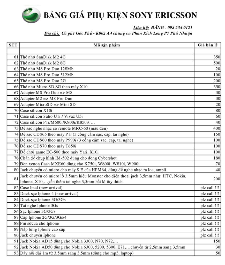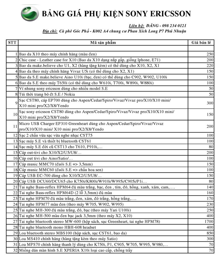 Chúng tôi xin gửi đến quý khách bảng giá phụ kiện sony ericsson áp dụng từ 14/09/2010 kèm lời tri ân sâu sắc đến toàn thể khách hàng!!!