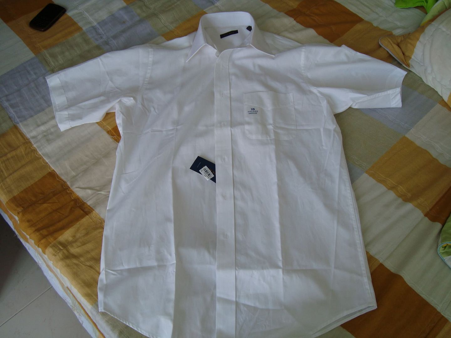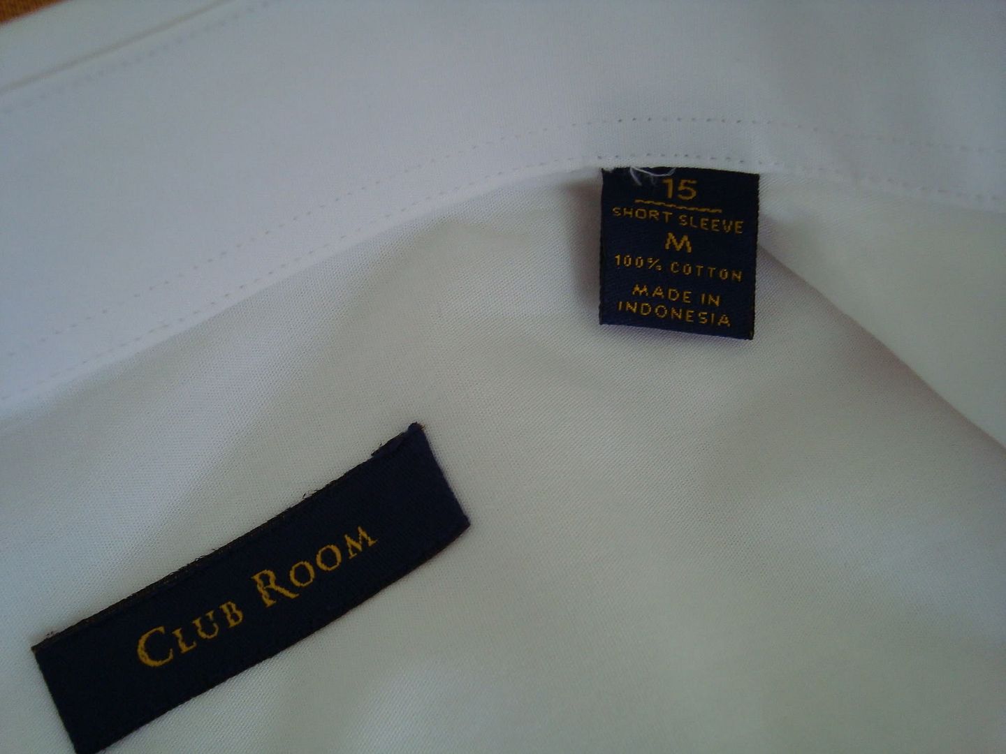 Người nhà gửi cho mình 5 cái sơ mi màu trắng, tay ngắn hiệu Club Room (thấy tem ghi thế), size M, trên áo để là ngực 15 và 15 1/2, to hơn size M của VN mình nên mình mặc ko vừa, giờ nhượng lại cho ai có nhu cầu. Kiểu áo lịch sự tao nhã, thích hợp mặc trang trọng hơn là để đi chơi ^^.